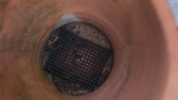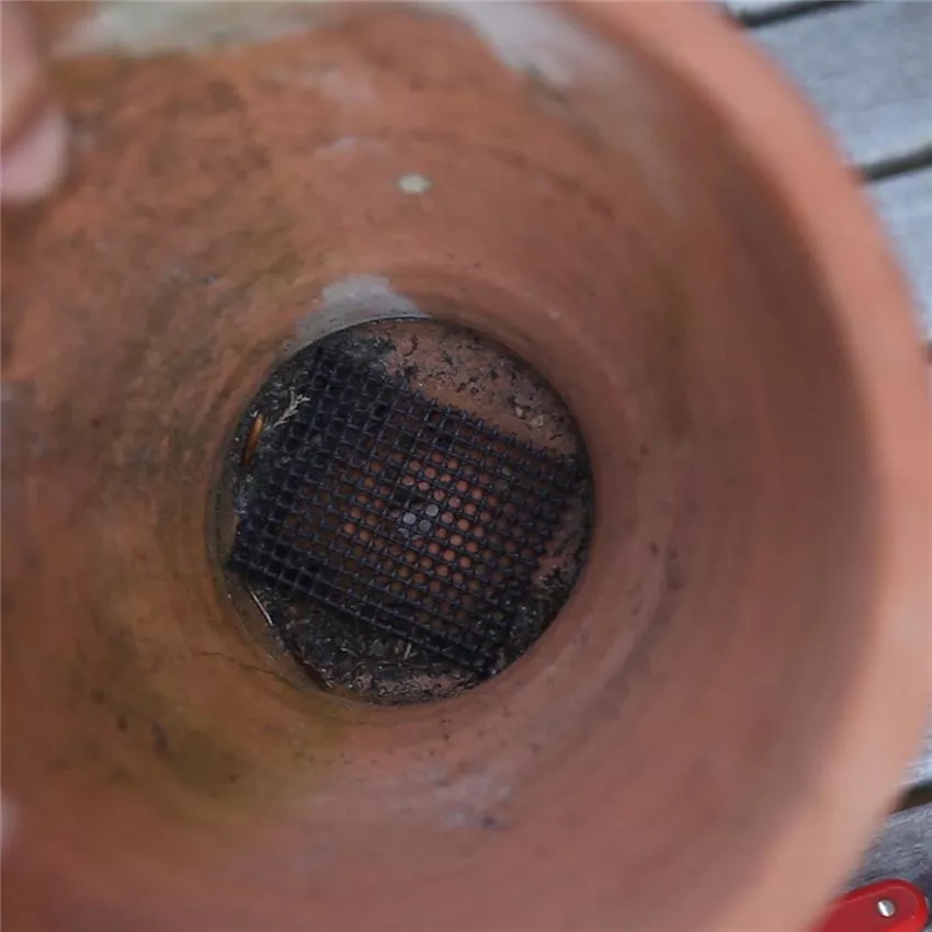 Damit die Erde nicht mit ausgeschwemmt wird, legen Sie ein Drainagegitter über die Öffnung.