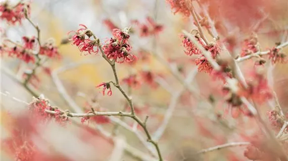 Kommen wir von weißem zu farbigem Flor. Da fällt sofort die Zaubernuss (Hamamelis) ins Auge. Kein Wintertag ist mehr öde und trist, wenn diese bizarre Schönheit blüht. Dieser prachtvolle Anblick war wohl die Ursache dafür, dass die Wünschelrutengänger sich ihre Zweige von dieser Pflanze schnitten, der sich geheimnisvolle Kräfte zusprachen. Lassen Sie eine gelb und eine rot blühende Pflanze ineinander wachsen! Ein weiterer gelber Winterblüher stellt sich mit dem Winterjasmin (Jasminum nudiflorum) vor. Bis in den Herbst hinein glänzt er mit seinem vornehmen Blattwerk, von dem er sich aber zum Winter verabschiedet. Stattdessen bietet er jetzt seine frostharten Blüten an. Auch ein Baum hat sich den frühen Winter für seine Blütezeit ausgesucht. Die Alstonia präsentiert sich am besten in größeren Gärten und Parkanlagen, denn sie wächst recht schnell und wird auch hoch. Er prangt das Jahr über mit seinem imposanten Blattwerk und ziert sich im November mit zarten grün-weißen Blüten.